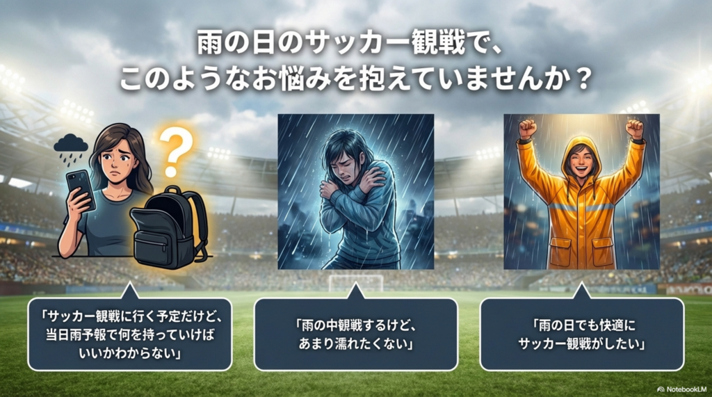 雨に日のサッカー観戦でこのような悩みを抱えている人は多いのではないでしょうか?