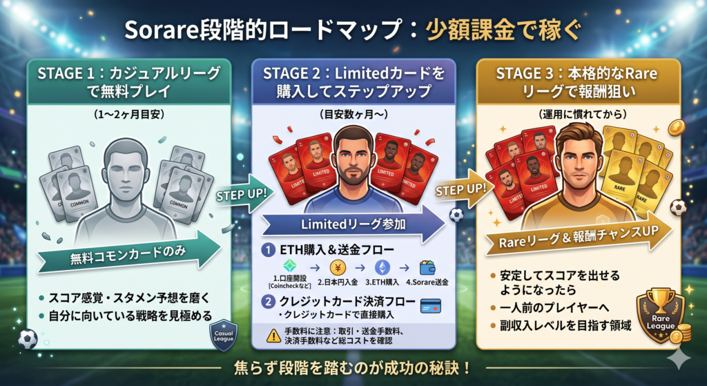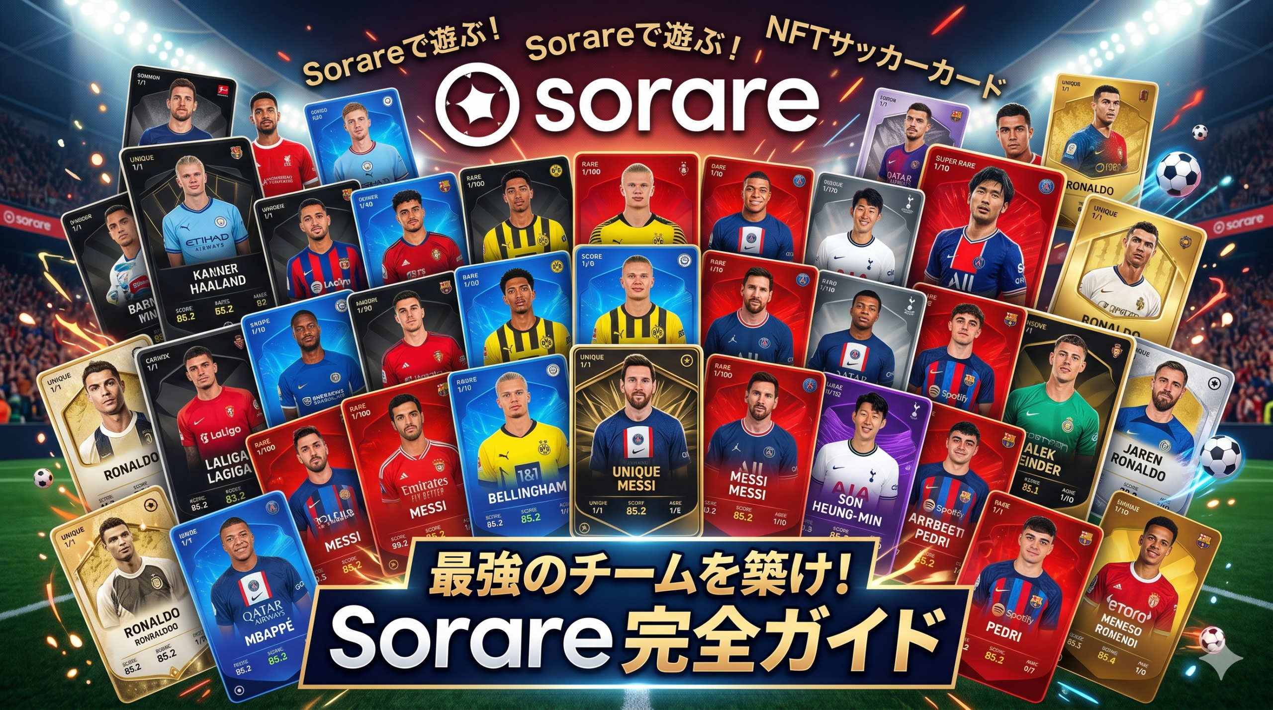 この記事では、Sorareを始めたい初心者が抱えるすべての不安を解消し、完全無料でスタートする手順から、少額で報酬を狙う段階的ロードマップまで、サッカーファン目線で徹底解説します。