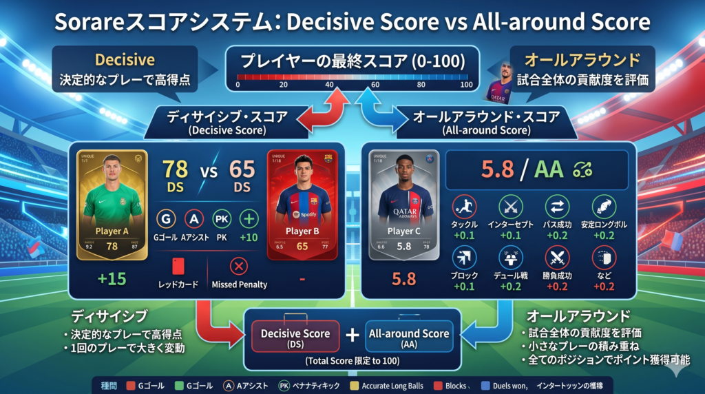 Sorareのスコアには「ゴール・アシスト系」「パスやタックル系の積み上げ型」の2種類があります。詳しくは後ほど図解的に解説します。