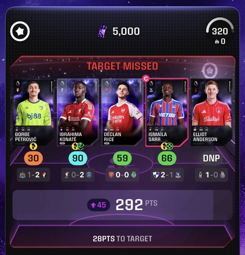 Sorareは、現実のサッカー選手カードを5枚集めてチームを組み、実際の試合のスタッツ(成績)でスコアを競うファンタジースポーツゲームです。