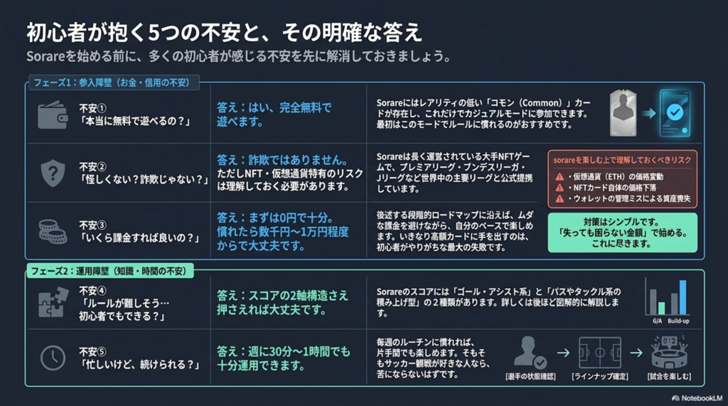 Sorareを始める前に、多くの初心者が感じる不安を先に解消しておきましょう。