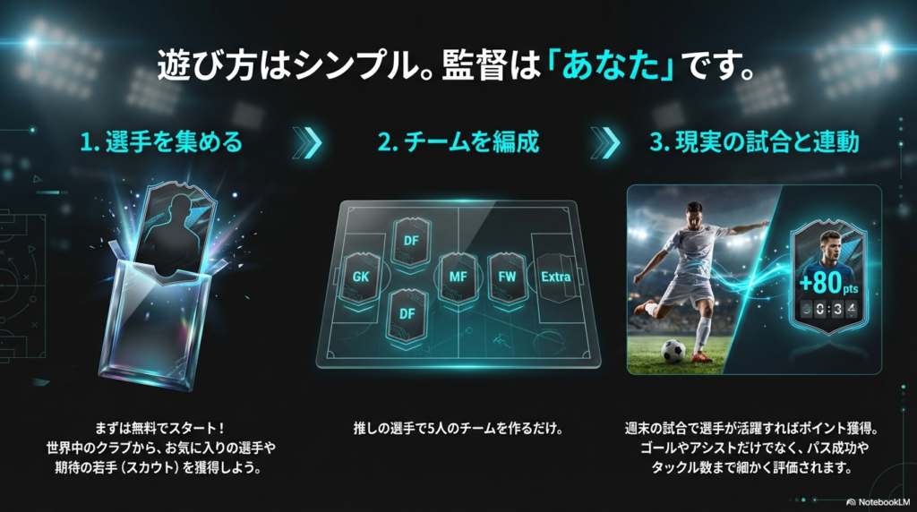 ファンタジーサッカーゲームとは実在するプロサッカー選手で架空のチームを作り、実際に試合の活躍に基づいてポイントを競うサッカーゲームです。