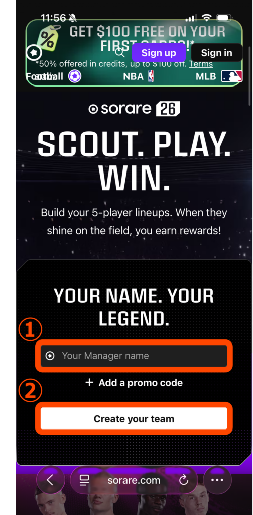 「私は16歳以上であることを証明し、Sorareの利用規約に同意し、私の個人データがプライバシーポリシーに従って処理されることに同意します。」